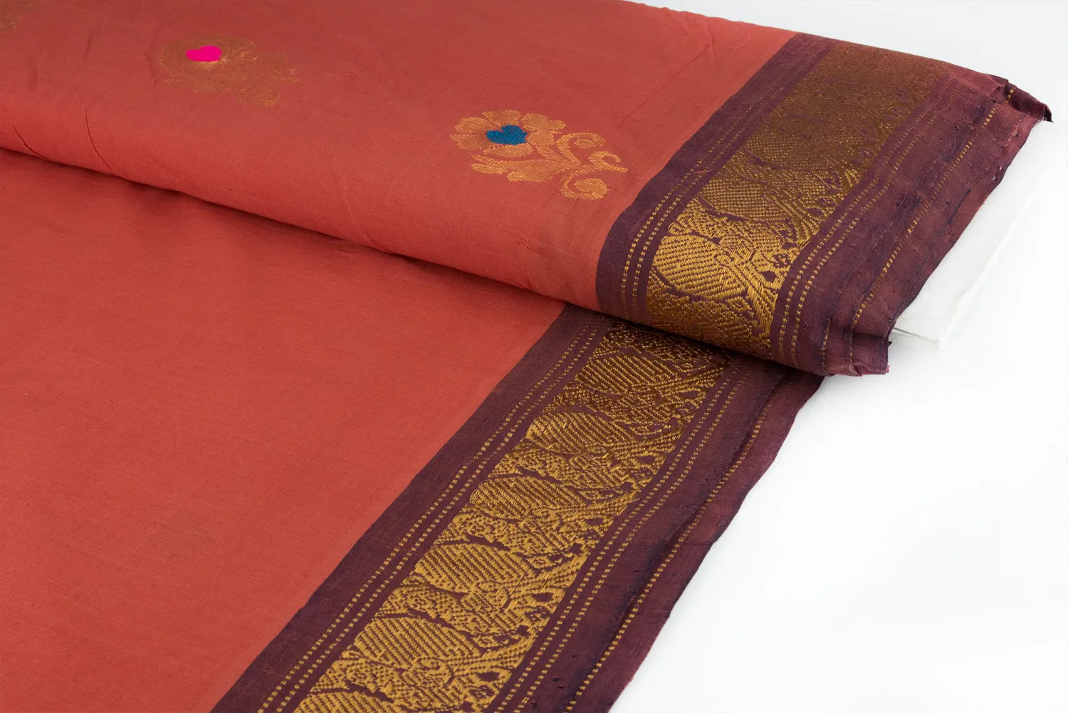 This handloom zari border fabric features a primary background in rust brown, decorated with large, beautiful zari floral motifs. The brown zari border, decorated with a row of peacocks, complements the main color, creating a harmonious and visually appealing combination.