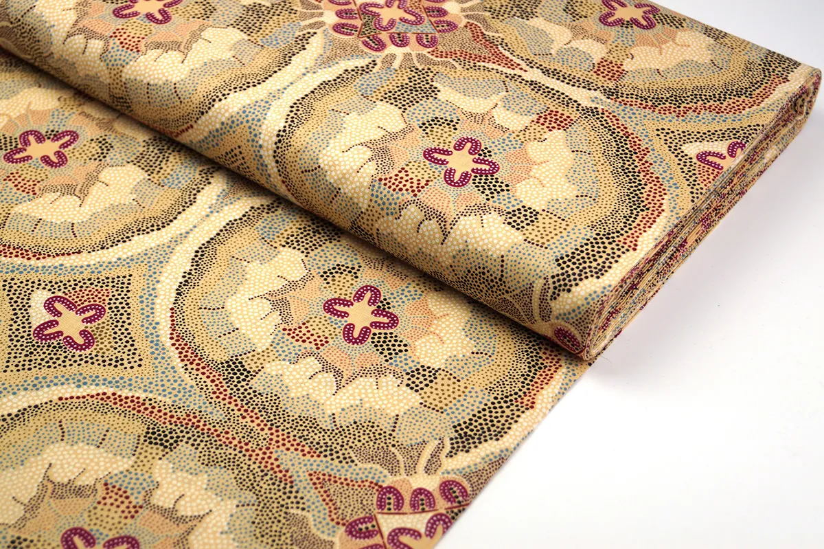 Feather-soft, high-quality cotton fabric with a lively Aboriginal design. Each pattern is designed by an Aboriginal artist and tells a story from their culture.